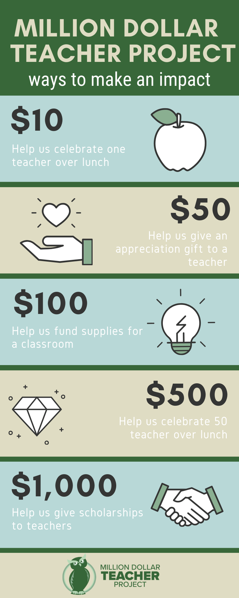 The annual Million Dollar Teacher Project fundraiser is a time to connect with the inner child in you and support our organization in reaching our goal of raising $100,000 to go towards out In Teacher We Trust Endowment Fund and operational costs. Enjoy a night field trip at Junior Achievement Biztown with cafeteria style food, an ice cream truck, live music and connecting with other community supporters. Attend the event as a group of friends, or purchase a ticket for your favorite teacher. Our fundraiser will be the best Adult Field Trip you have ever taken!